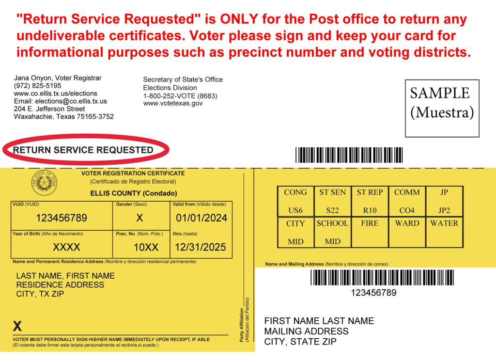 If you notice the phrase “Return Service Requested” on the card (see the image below), please understand that this is not an instruction for the voter. This phrase is a standard postal instruction intended only for the U.S. Post Office. It informs the Post Office that if the card is undeliverable, it must be returned to the county election office. If you return the card, the county office will assume the Post Office was unable to deliver it to you. This provides reason for them to believe you have moved since registering, which will place your voter registration status on “suspense.”
