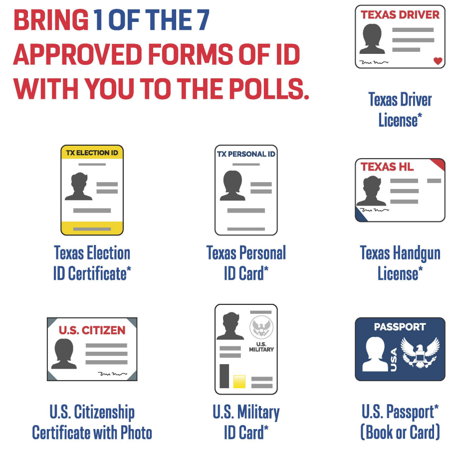 To vote in person in Texas, you need to present one of the seven acceptable forms of photo identification. You can bring a Texas Driver License, U.S. Passport, a Texas Personal ID Card, Texas Election ID Certificate, a U.S. Citizenship Certificate with photo, a U.S. Military ID Card, or a Texas Handgun License.